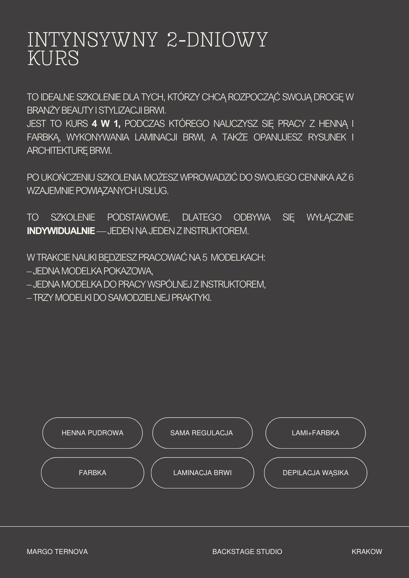 To idealne szkolenie dla tych, którzy chcą rozpocząć swoją drogę w branży beauty i stylizacji brwi. Jest to kurs 4 w 1, podczas którego nauczysz się pracy z henną i farbką, wykonywania laminacji brwi, a także opanujesz rysunek i architekturę brwi.